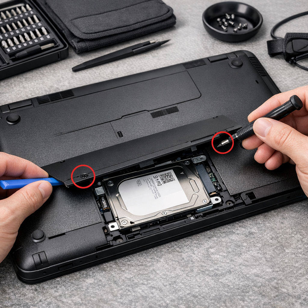 Flip the laptop over. To start the HP laptop hard drive removal, find the screws on the bottom panel. Look closely! Some screws hide under rubber feet or stickers. I often use a plastic tool to pop the cover open gently.