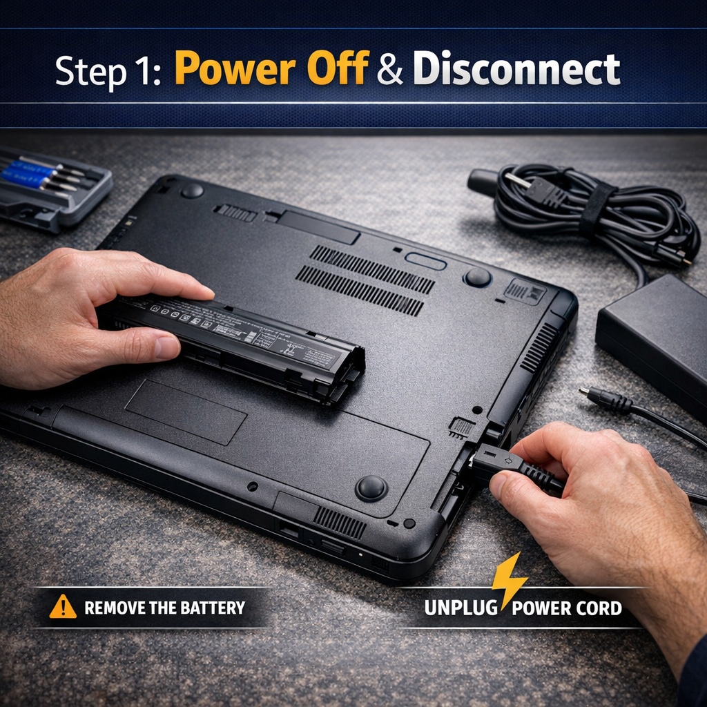 Let’s cut the power completely. Shut down the laptop, unplug the charger, and take out the battery to stay safe. This step stops any sparks or shorts. If your battery is sealed inside, don’t worry. You can unplug it after you open the case.