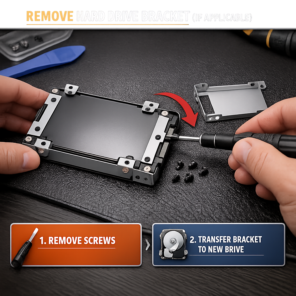 Look at the drive you just pulled out. You need to unscrew the metal bracket or caddy from the old drive. You must move this bracket to your new drive. Keep these tiny screws safe.
