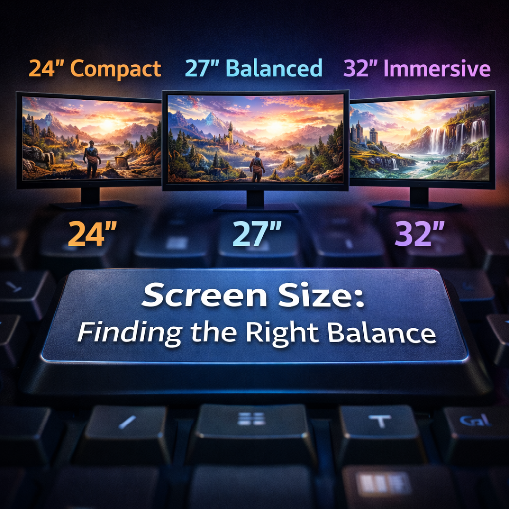 Screen size is like choosing the right seat in a movie theater. Too small, and you miss details. Too large, and you’re constantly moving your head. When people ask what to look for in a gaming monitor, screen size always comes up early because it directly affects visual ergonomics and on-screen focus.